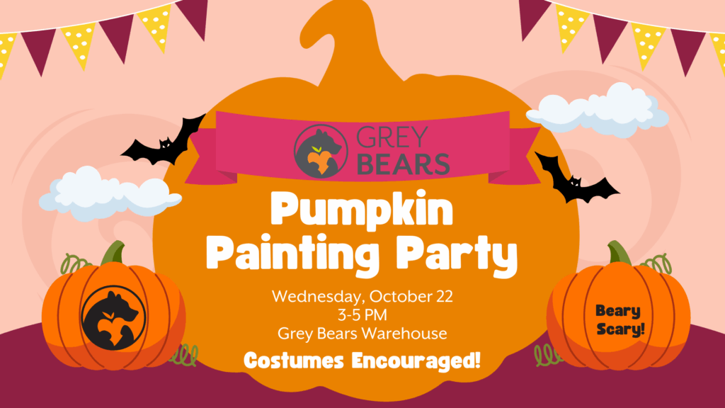 Join us October 22 for a pumpkin painting workshop in the Grey Bears Warehouse! Grey Bears will supply pumpkins, paint and decor to make your own spooky masterpiece. Costumes are encouraged!